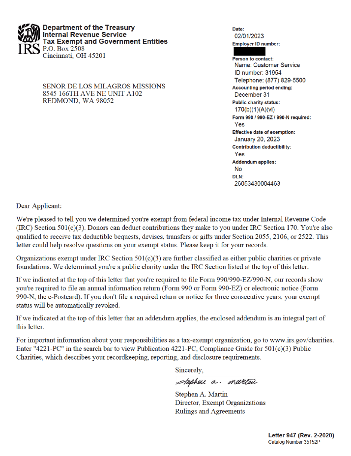 As per the letter received dated 02/01/2023, “donors can deduct contributions they make” to us under IRC Section 170. The nonprofit is also “qualified to receive tax deductible bequests, devises, transfers or gifts under Section 2055, 2106, or 2522”. The charity has been classified as a “public charity”.